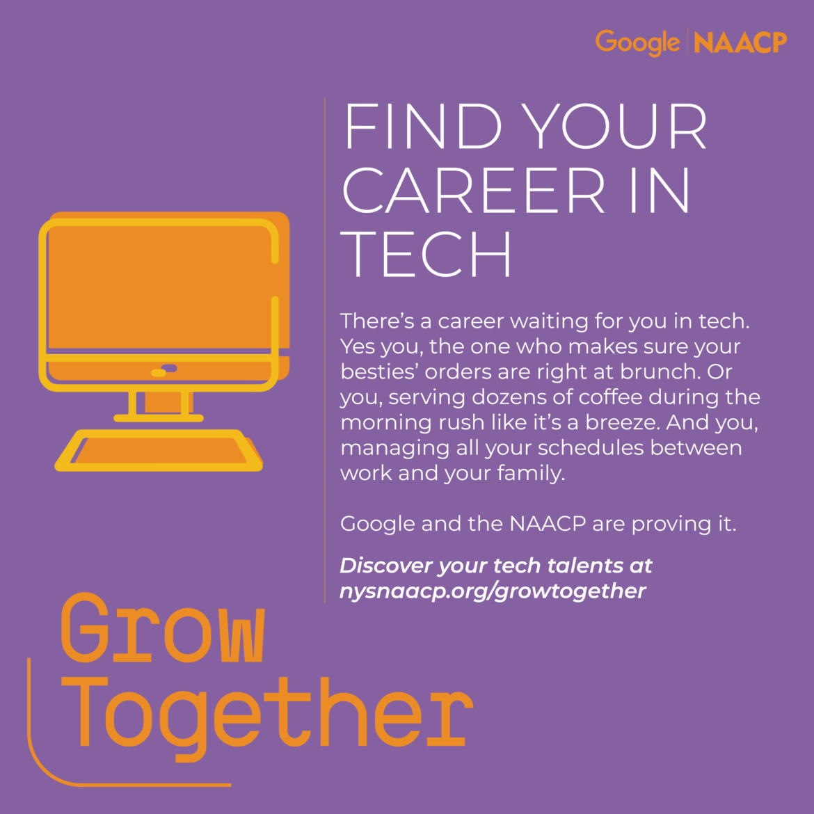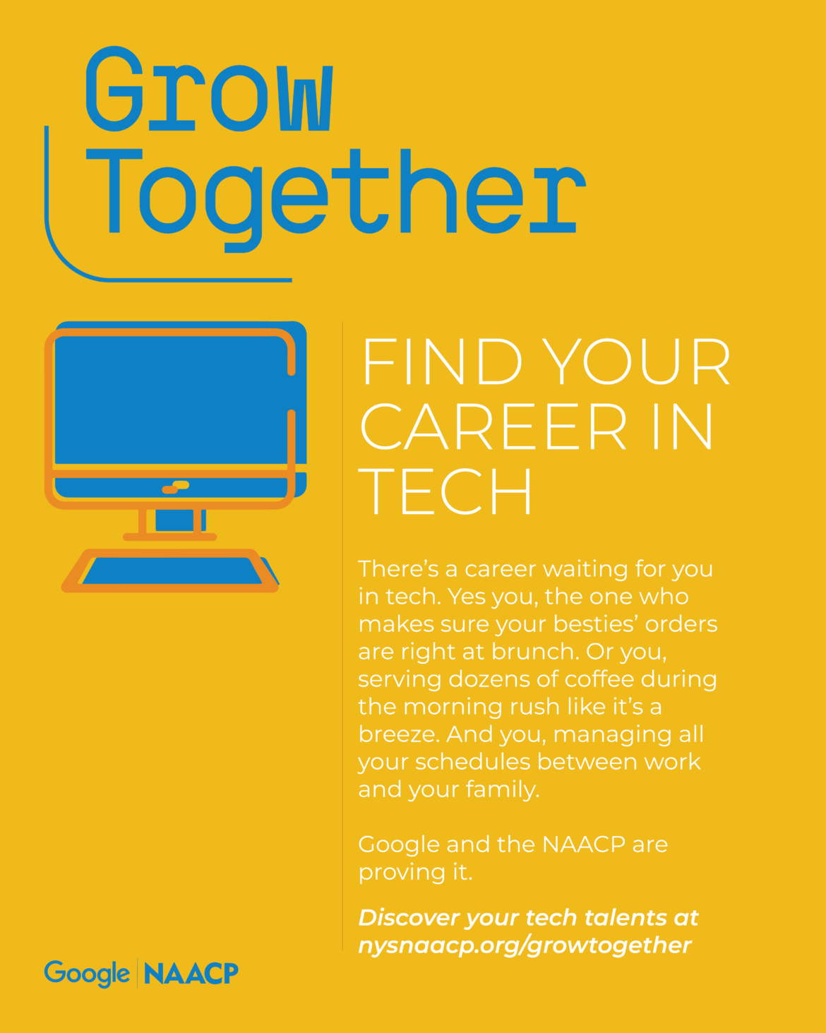 “Grow Together” is the groundbreaking partnership between the NAACP New York State Conference and Google, a pivotal element of the NAACP’s “Tech Forward” initiative.